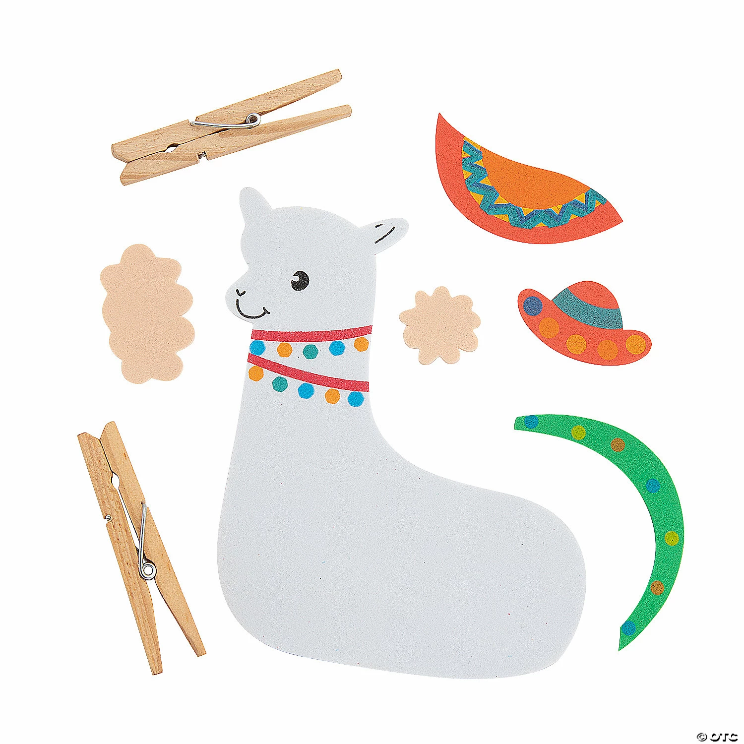 These fiesta llamas are ready to party! This fun craft kit uses clothespins and other included materials to create a fiesta llama clad in colorful accoutrements. A great choice for a kidsโ activity table at a fiesta themed gathering, this craft kit will also work well as a classroom art project near Cinco de Mayo or any other celebratory event. Includes self-adhesive foam pieces and wood clothespins. 5 1/4″ x 10″ Makes 12. All craft kit pieces are pre-packaged for individual use. Kits include instructions. ยฉ OTC